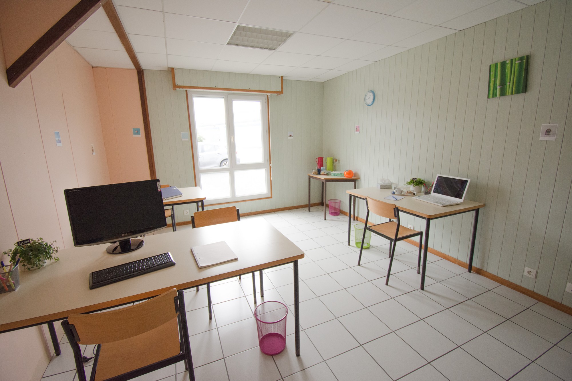 Cet espace compte 4 postes de travail individuels qui comprennent une table(140m x 0.80), 1 ou 2 chaises et 1 plante.