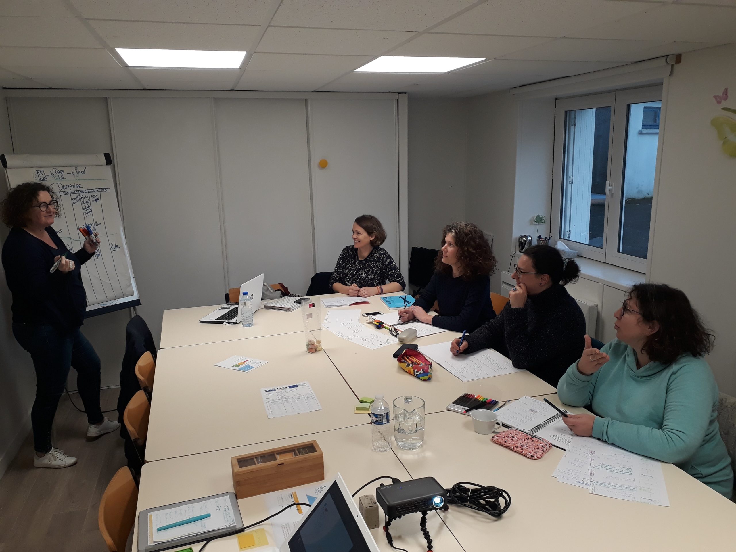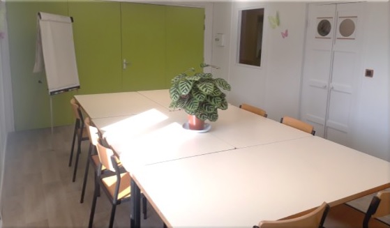 Cette salle pour 5 à 18 personnes contient 5 à 8 tables (1.40m x 0.80m et 1.60m x 0.80m), 10 à 18 chaises, 1 paperboard et des marqueurs.